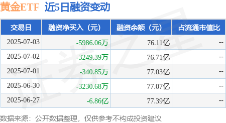 本站消息,7月3日,黄金ETF(518880)融资买入1.42亿元,融资偿还2.02亿元,融资净卖出5986.06万元,融资余额76.11亿元。